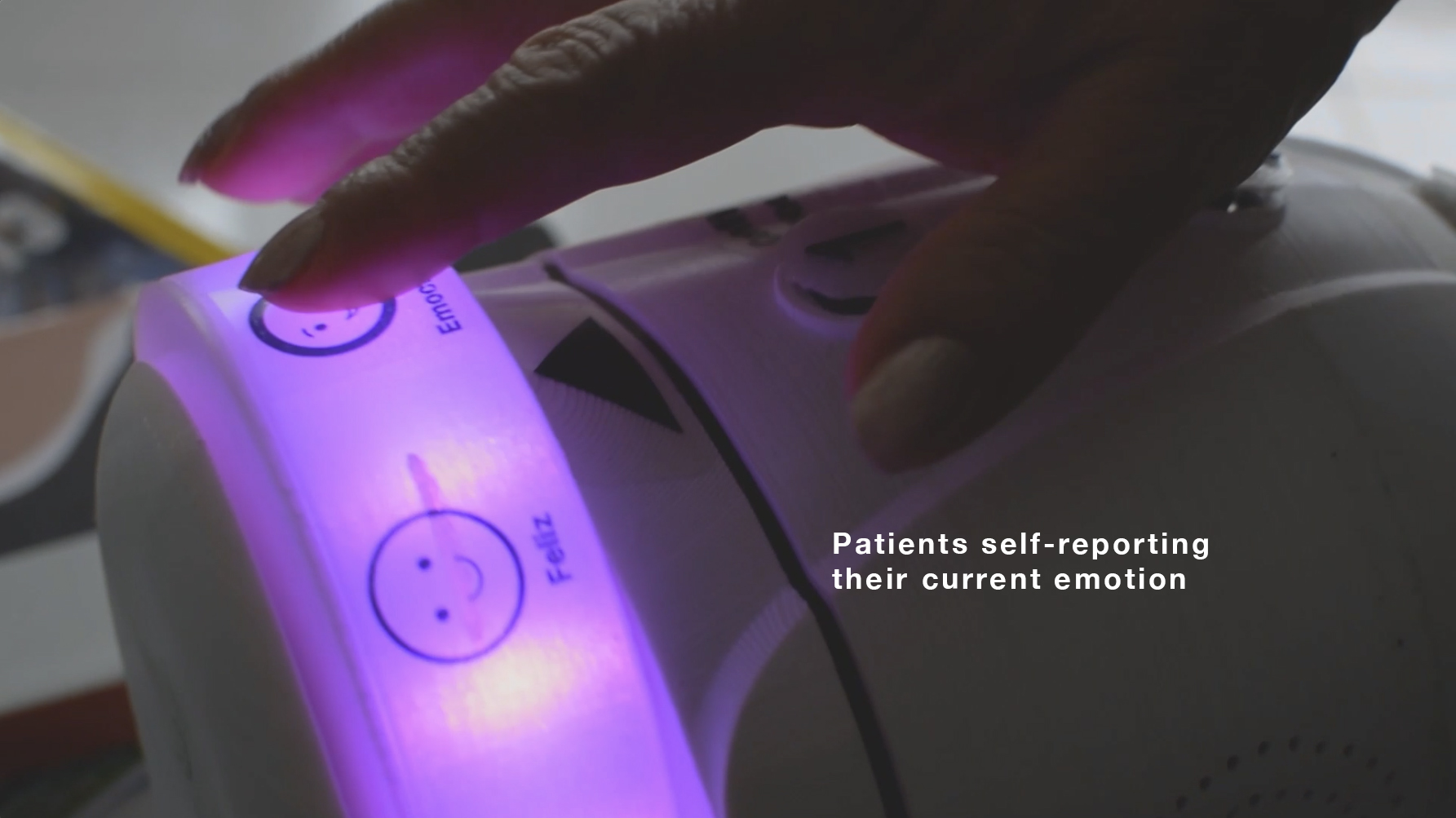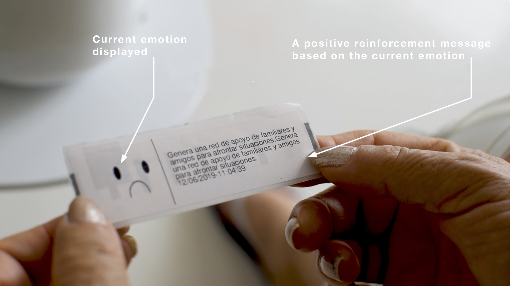 EMMA, a tangible user interface, prompted patients to interact with the device to self-report their emotions and reasons behind their current experience by two input mechanisms: emotion carrousel selector and audio recording correspondingly. This information was recorded and assessed by EMMA, providing a positive reinforcement feedback according to the current patient’s emotional state by means of a printed message sticker . This “physical output” was later kept in a diary in which both patients and doctors were able to have a “big picture” of their progress over time triggering awareness and self-reflection. EMMA aimed to be reflective, enabling meaningful information to activate patients’ awareness about the course of their recovery and to help them to cope with the dynamic changes of the recovery.