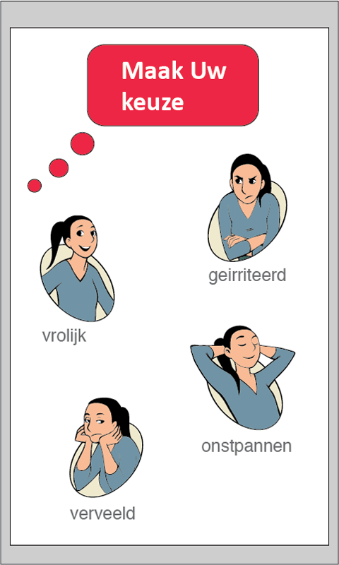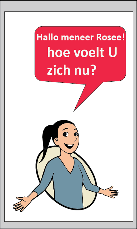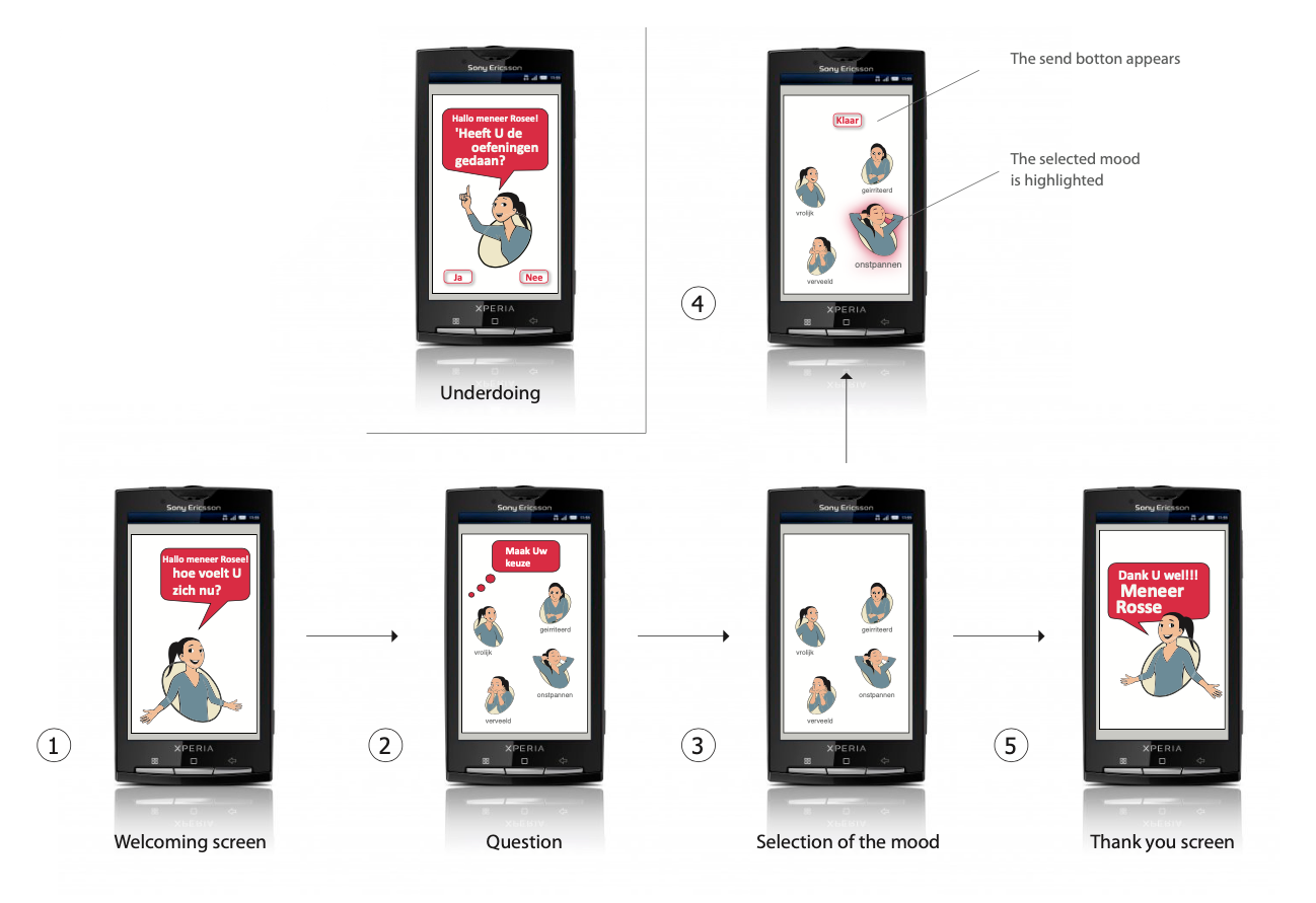 ESTHER 1.0 was designed as an in-situ, self-reporting tool that provides contextual and experiential variables by patients during their home recovery process. Based on Experience Sampling Method (Larson and Csikszentmihalyi, 1993), this tool provided a fixed interval sampling protocol using a step-by-step interactive questionnaire embedded in a tablet. The Pictorial Mood Reporting Instrument, PMRI, (Vastenburg et al., 2011) was chosen, as an easy-to-use mood capturing technique. The design of the tool was informed by focus groups observational testing sessions.