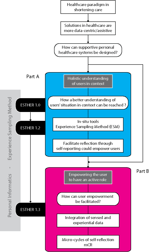 Three prototypes where tested in the field. ESTHER 1.0 studied the value to facilitate reflective mechanisms. In ESTHER 1.2, the in-situ self-reporting principle was extended with contingent experience sampling by means of on-body sensor nodes as it addressed the technical challenges of integrating self-reporting and automatically collected sensor data. ESTHER 1.3 was built to expand upon a design model for developing future personal reflective interfaces.