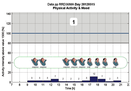 The implementation of field studies with the three prototypes resulted in a considerable amount of qualitative and quantitative raw data. Based on Grounded Theory framework GT (Glaser and Strauss , 1967), different units of coding analysis were developed to describe the sensitivity longitudinal and granularity of the self-reported data. In addition to response rate, average lengths of the reports, and time between prompts and responses, sensed data from sensors were quantified and then linked to the self-reporting prompts. Following, some samples of different data analysis visualization: